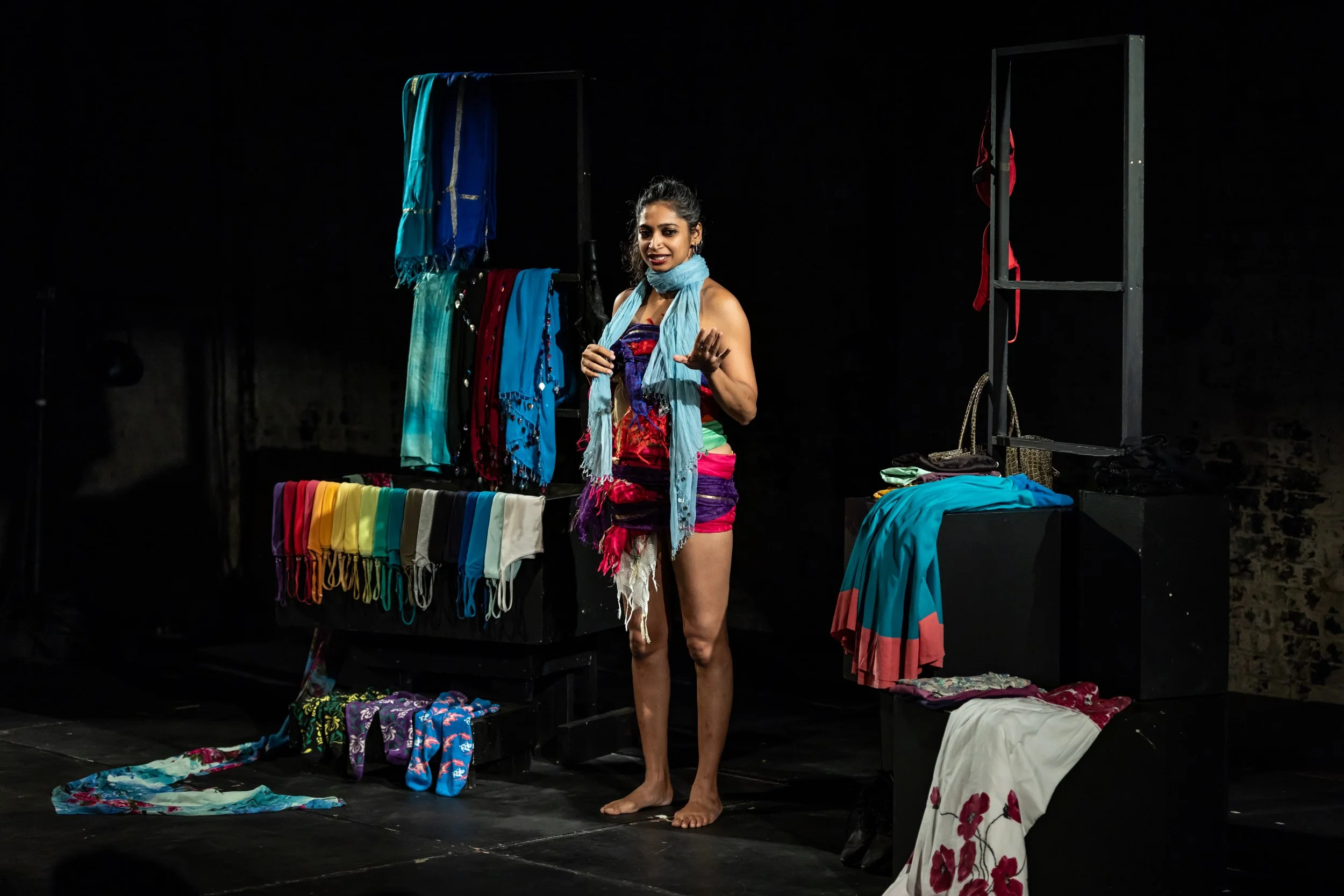 In a performance that leads with satire, but delivers a heavy pragmatic punch, this lengthy opening – this protracted moment of nudity, silence, provocation, shock, and vulnerability – both unsettles the audience and endears them to her. By the time Taneja makes her first movement – the slow, gentle act of tying up her hair – it is already a devastating performance.