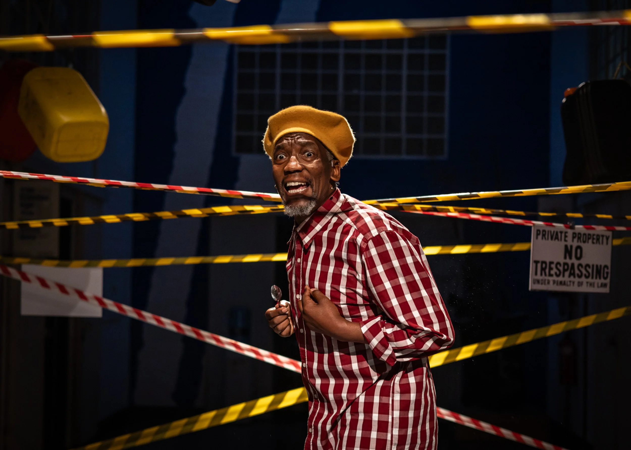 In The Atrium of The Centre for the Less Good Idea, a crowd is gathered beneath a criss-crossing canopy of danger tape and dangling signs. At the centre of the scene is a grave of bottled water, with a body beneath it. From it, emerges the performer Sello Pesa, and so begins Ngoana oa Noka ea Kubetu.