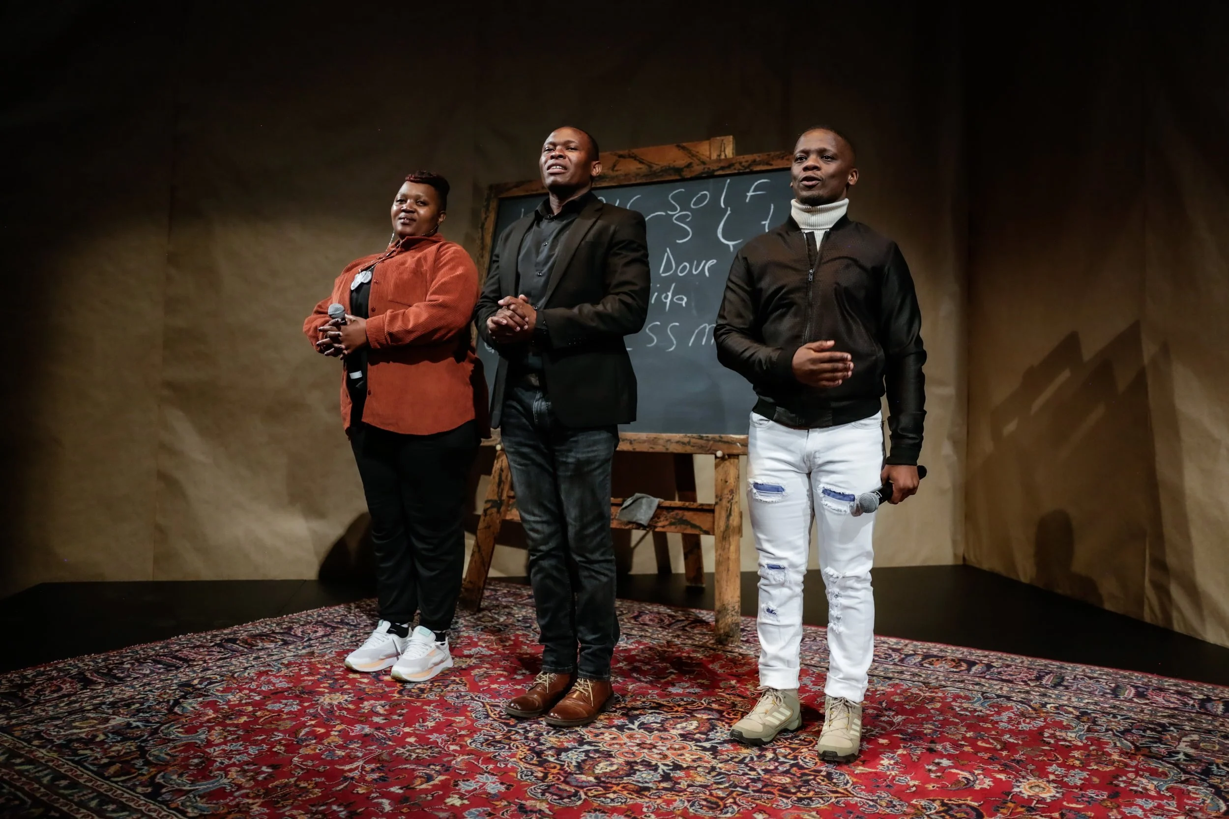 Sbusiso Shozi leads a collective compositional moment with the audience, assisted by Dikeledi Modubu and Xolisile Bongwana. Photographer | Zivanai Matangi