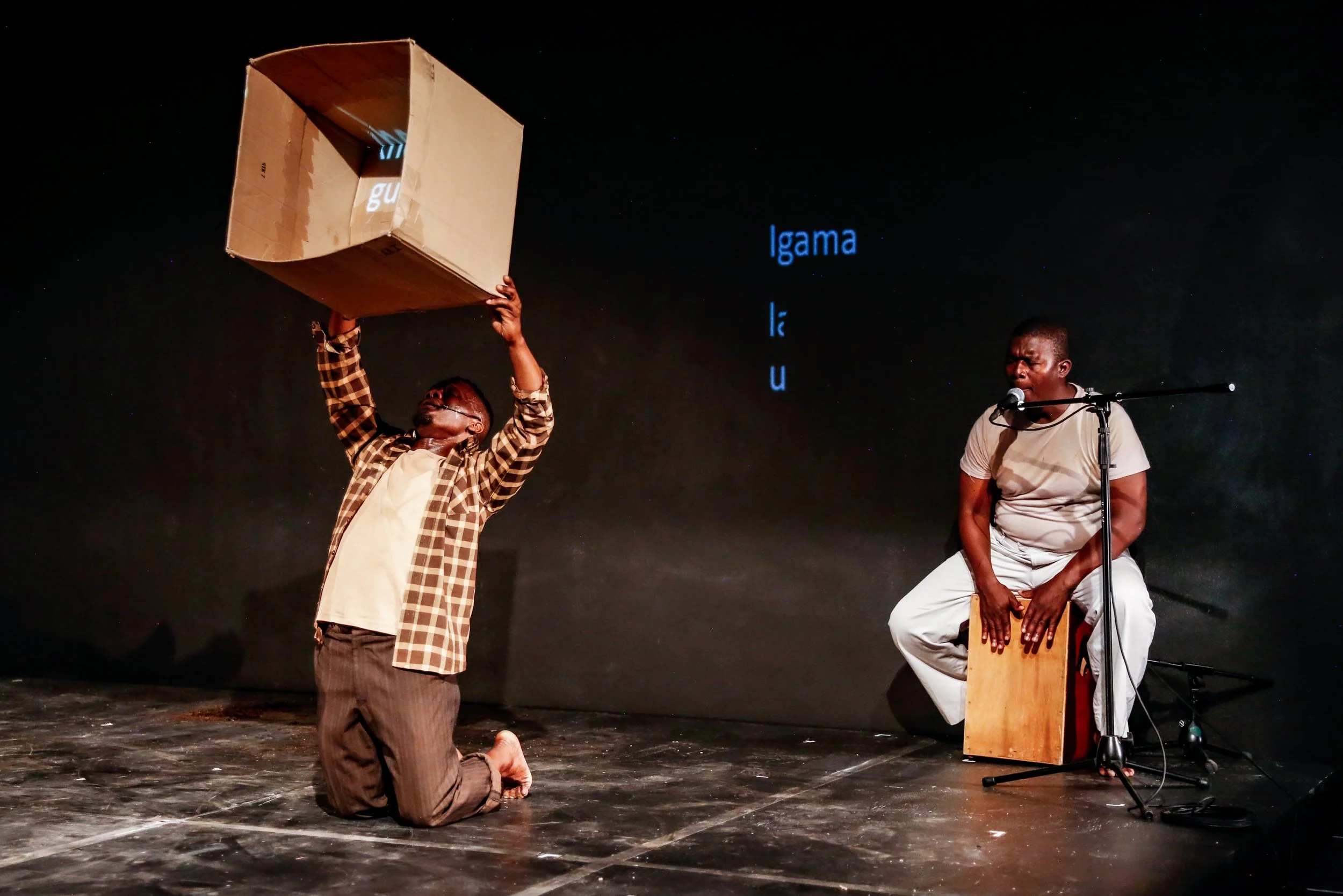 Ndiguye Endinguye essentially constructs a compelling narrative out of two sticks, a sheet and a cardboard box. A short-form theatre work merged with resounding musical performances, the sound, meaning and essence of a name are picked apart and explored through these respective modes of performance. Offstage and to the side, Anathi Conjwa, Zimbini Makwetu and Thabo Rapoo develop a layered and lyrical score to Bongwana’s sharp and symphonic choreography.