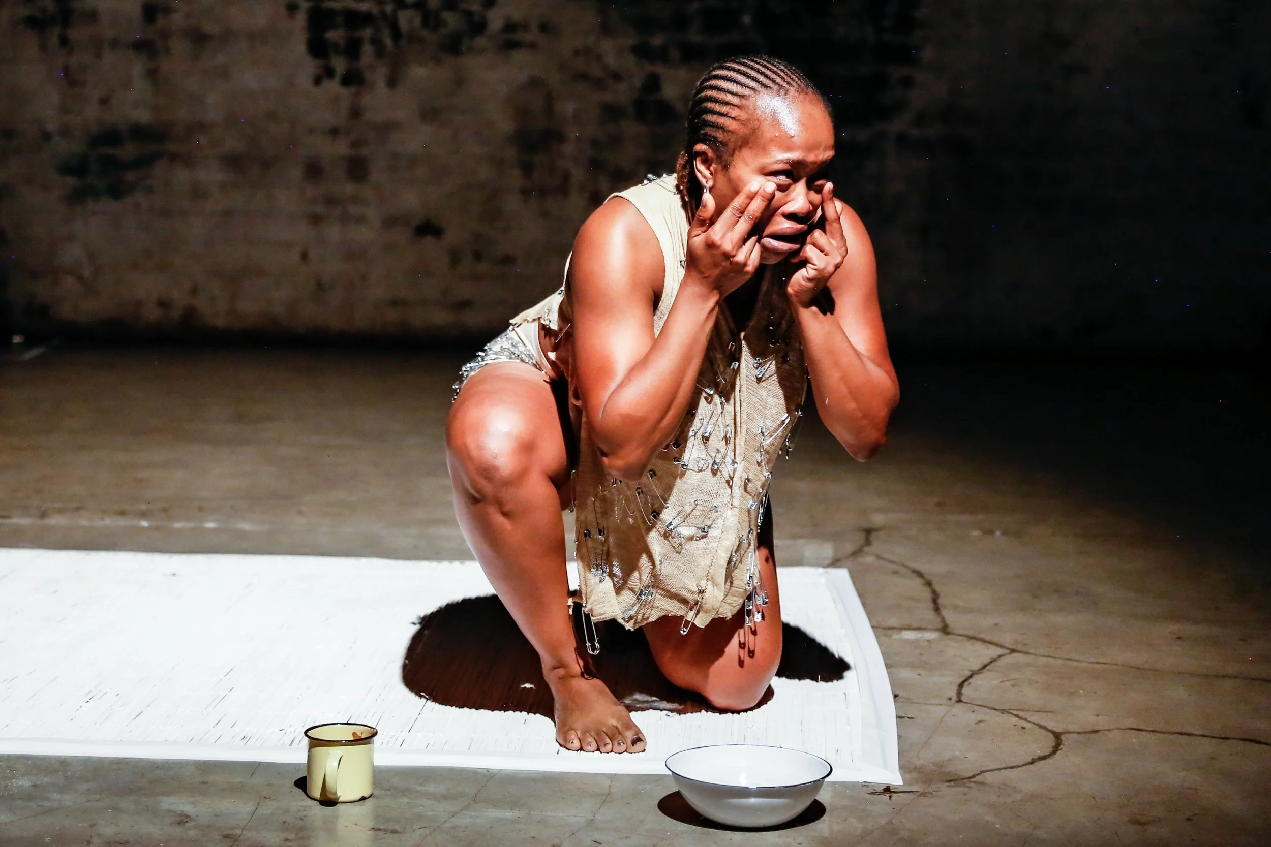 Two cloaked figures (Thulisile Binda and Muzi Shili) sit in a basin, surrounded by language, music and the distinctive smell of imphepho. They are intertwined, bound by duty. When they do eventually move, it is in unison – slowly, delicately.