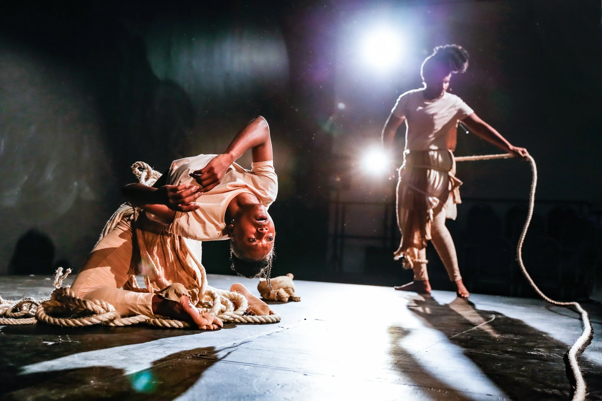 “Please guide me, lead me through, lead the way, enlighten me,” reads the text behind the two performers (Zimbini Makwetu and Zaza Cala) occupying separate ends of the stage. Rope snakes its way through the space between them, simultaneously grounding them and binding them, restraining their movement, nurturing their gestures.