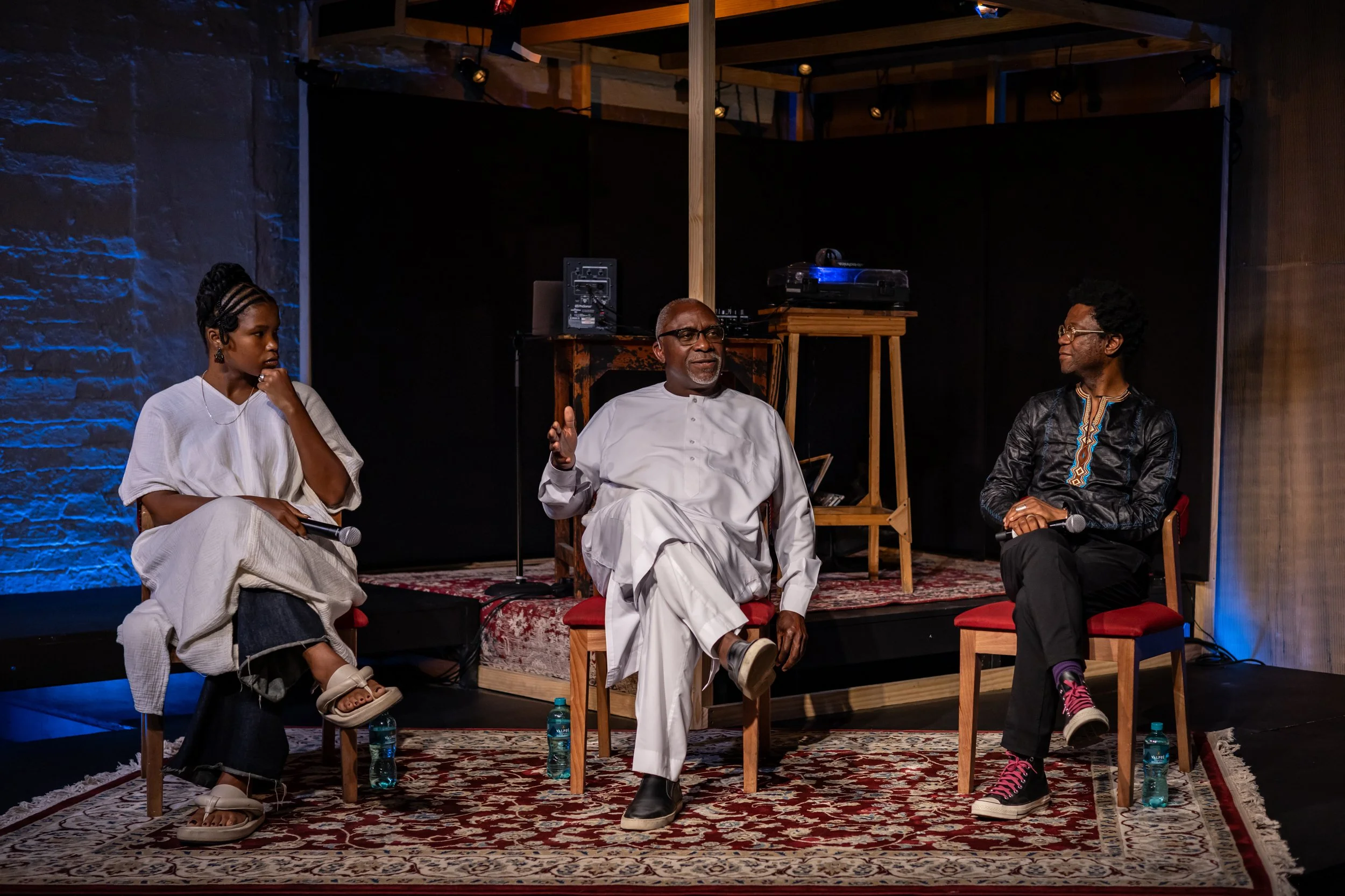 Moderated by The Centre for the Less Good Idea’s Impresario, Neo Muyanga, the conversation begins with a reflection on music as a powerful form of cultural production, and the various forms of oppression that have attempted to silence this production. “That’s why they banned things like the drum, the percussive, the choral, because it’s unifying, it’s powerful,” says Muyanga.