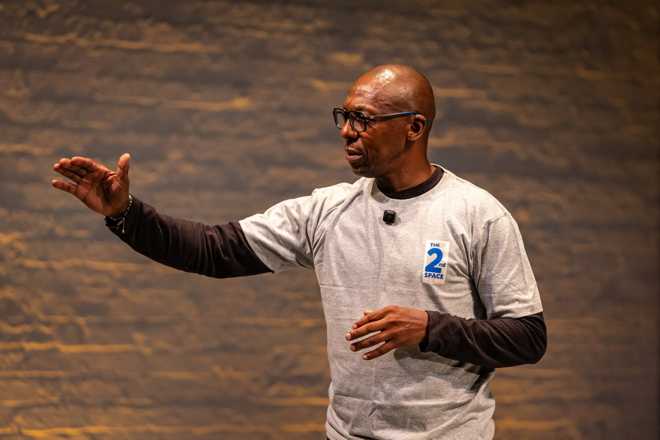 The workshop opens with a grounding exercise. Where are our bodies, asks Mantsoe? In which context, what material, spiritual environment are they situated? He begins by drawing attention to the body’s connection to the ground – “We are standing on a wooden dance floor, beneath this, concrete, beneath that, the earth itself.”