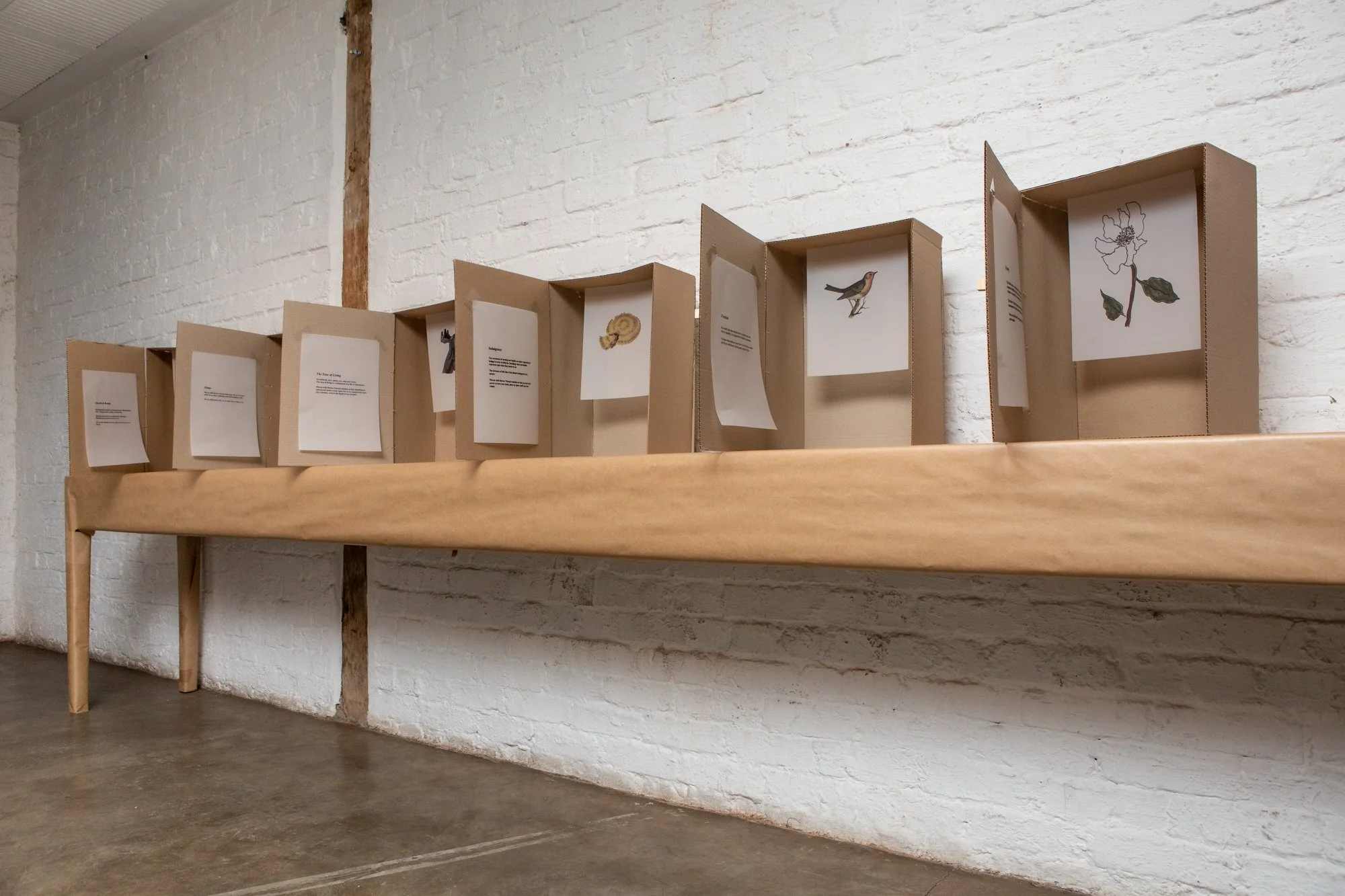The exhibition, titled Thinking in Poetry and Cardboard, features cardboard models and short videos created through the Thinking in Cardboard Mentorship Programme, short videos from the Poetry Minute series curated by Bongile Gorata Lecoge-Zulu, and videos showcasing the poetry of Woven with Brown Thread, an anthology as part of the Khala Series | 100 Poem project.